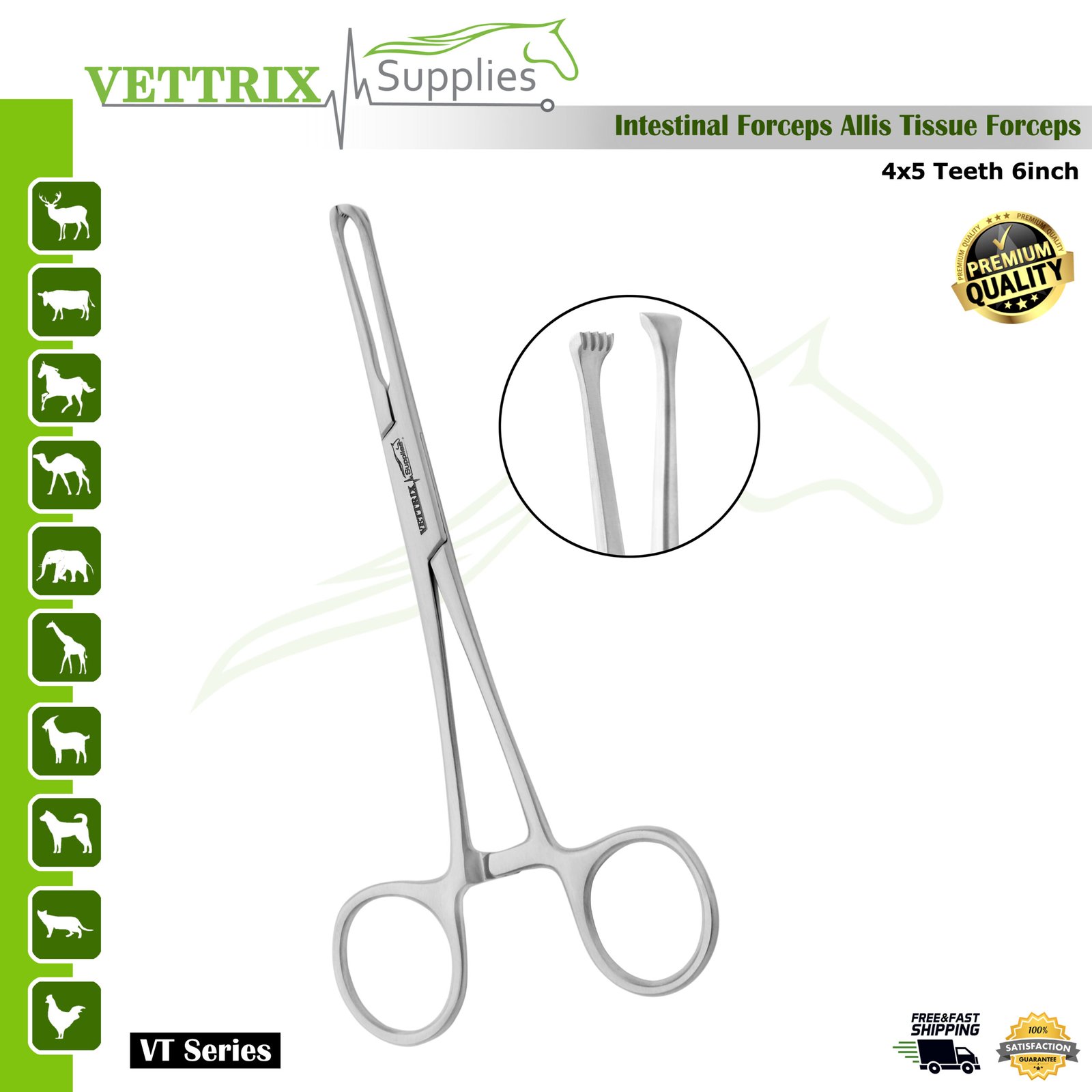 Vettrix Supplies provides professional grade surgical instruments trusted by practitioners worldwide. The Allis Tissue Forceps 6 inch 4×5 Teeth deliver secure grip, precision, and durability, making them a staple tool in surgical practice.
