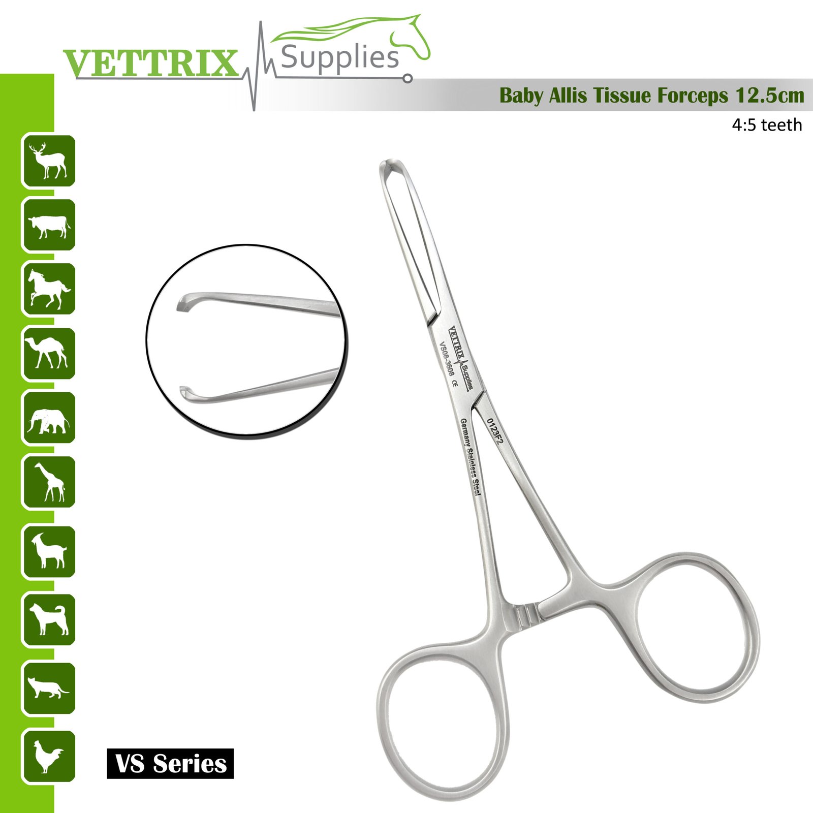 Vettrix Supplies delivers professional-grade surgical instruments trusted worldwide. The Baby Allis Tissue Forceps 12.5 cm, 4×5 Teeth combine precision, durability, and ergonomic design, ensuring reliable performance in every procedure.