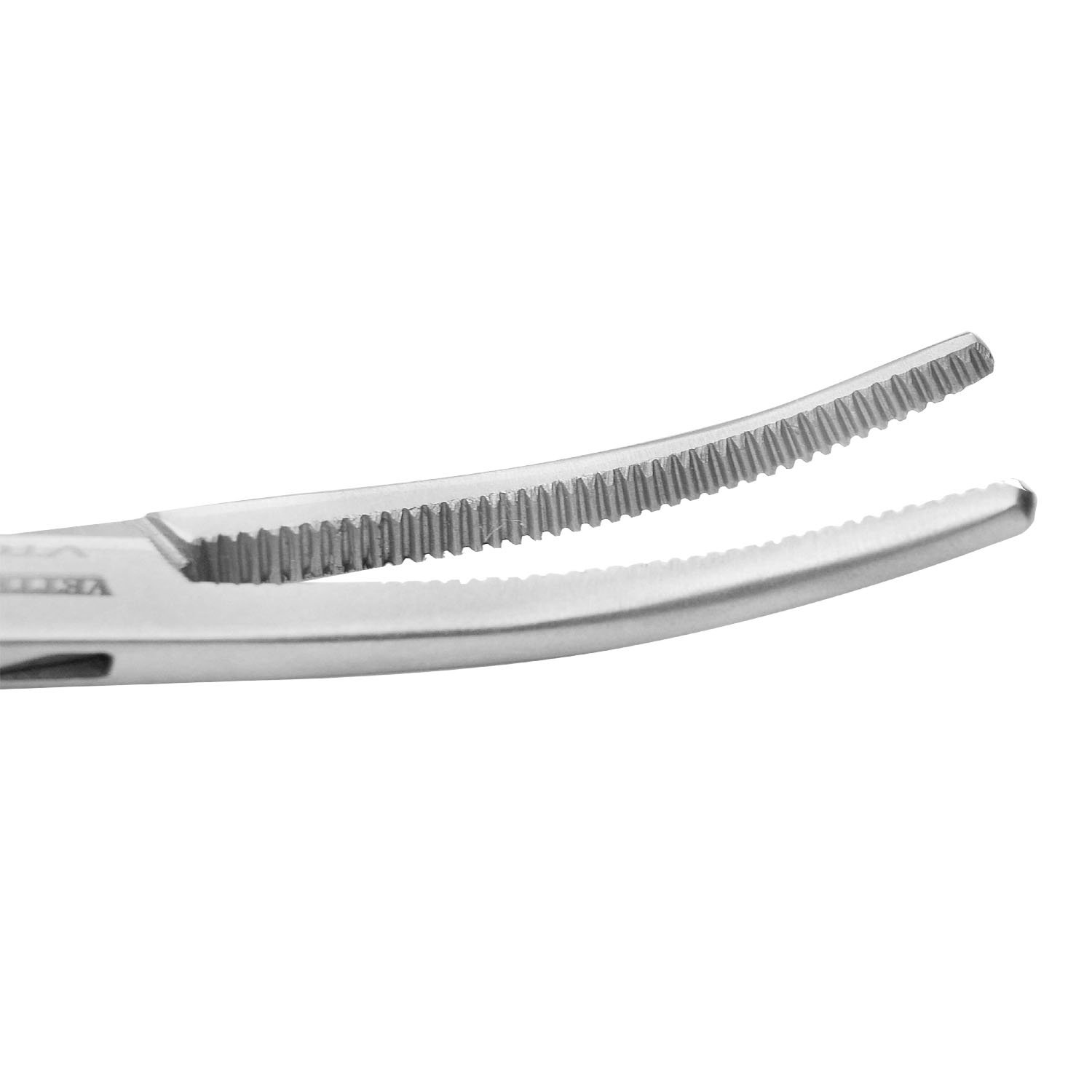 - Curved jaws with serrations for secure tissue and vessel clamping