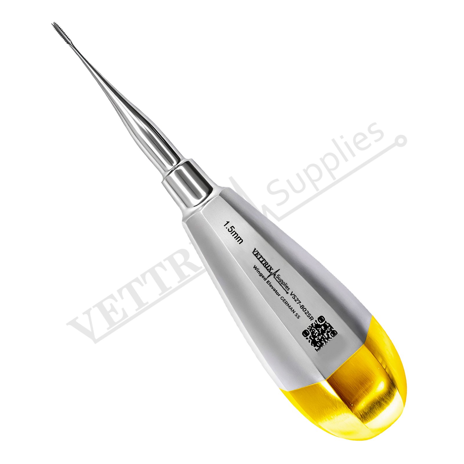 At Vettrix Supplies, we manufacture and supply professional-grade dental and surgical instruments trusted globally for their quality and reliability. The Winged Elevator Golden Serrated Handle 1.5mm provides enhanced grip and control, making it ideal for delicate extractions. You might also be interested in our Winged Luxating Elevators Set Of 5 for a lightweight alternative.